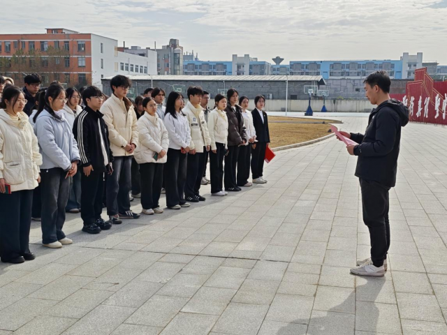 优秀团员代表王彬宇随后发言。他从“珍视荣誉,牢记使命”、“勇于担当,直面挑战”、“团结协作,共同进步”、“不忘初心,坚守信念”四个方面分享体会,勉励新团员将荣誉化为责任,在团组织的平台上锻炼成长、贡献力量。发言结束后,王彬宇同学带领全体新发展团员,面向团旗,紧握右拳,庄严宣誓,铿锵誓言在广场上空回荡,彰显了新时代青年坚定的理想信念。
