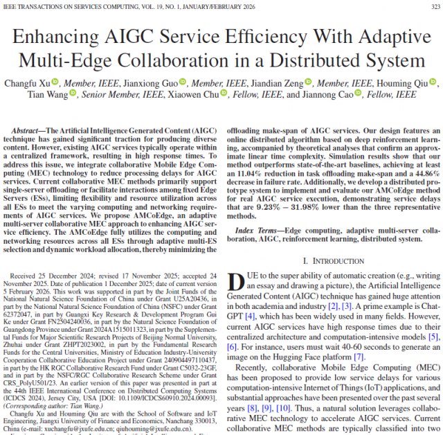 近日,银河娱乐集团-银河娱乐博彩-银河娱乐官网 徐常福老师以第一作者在服务计算领域国际顶级期刊IEEE Transactions on Services Computing(CCF A类期刊,校定A类期刊)上发表论文,论文题目为“Enhancing AIGC Service Efficiency with Adaptive Multi-Edge Collaboration in A Distributed System”。