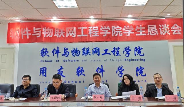 为畅通师生沟通渠道,精准回应学生关切,2026年4月15日下午,银河娱乐集团 在荟庐二楼会议室召开院学生恳谈会。院党委书记季小刚、副院长(行政牵头负责人)毛澄映、院党委副书记匡琳、副院长罗远胜、副院长汪靖,软件工程(中外合作办学)系主任刘燕青,专职辅导员陶丽、邹璐、王安亮,研究生、本科生各年级学生代表共坐一堂,以“面对面,拉家常”的形式聚焦宿舍安全、教学优化、校园生活等议题,倾听学生诉求,共商解决方案。